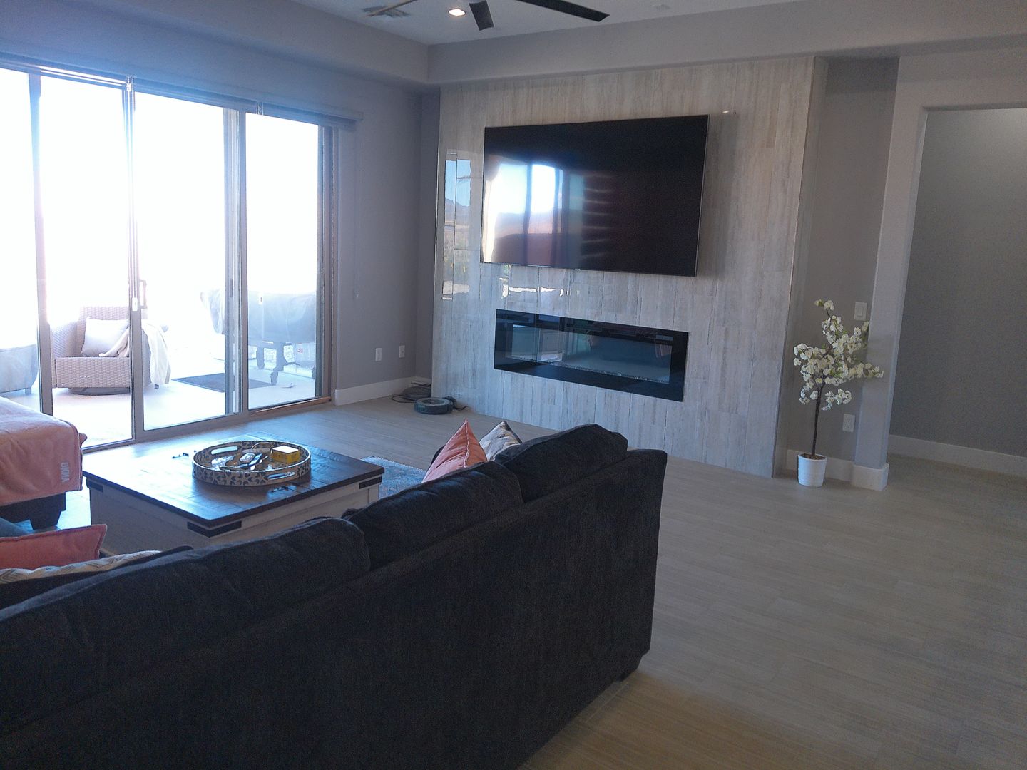 Open floor plan that seamlessly connects the kitchen to the living room, complete with a large sectional sofa, flat-panel TV, and a warm fireplace—perfect for relaxing or entertaining.