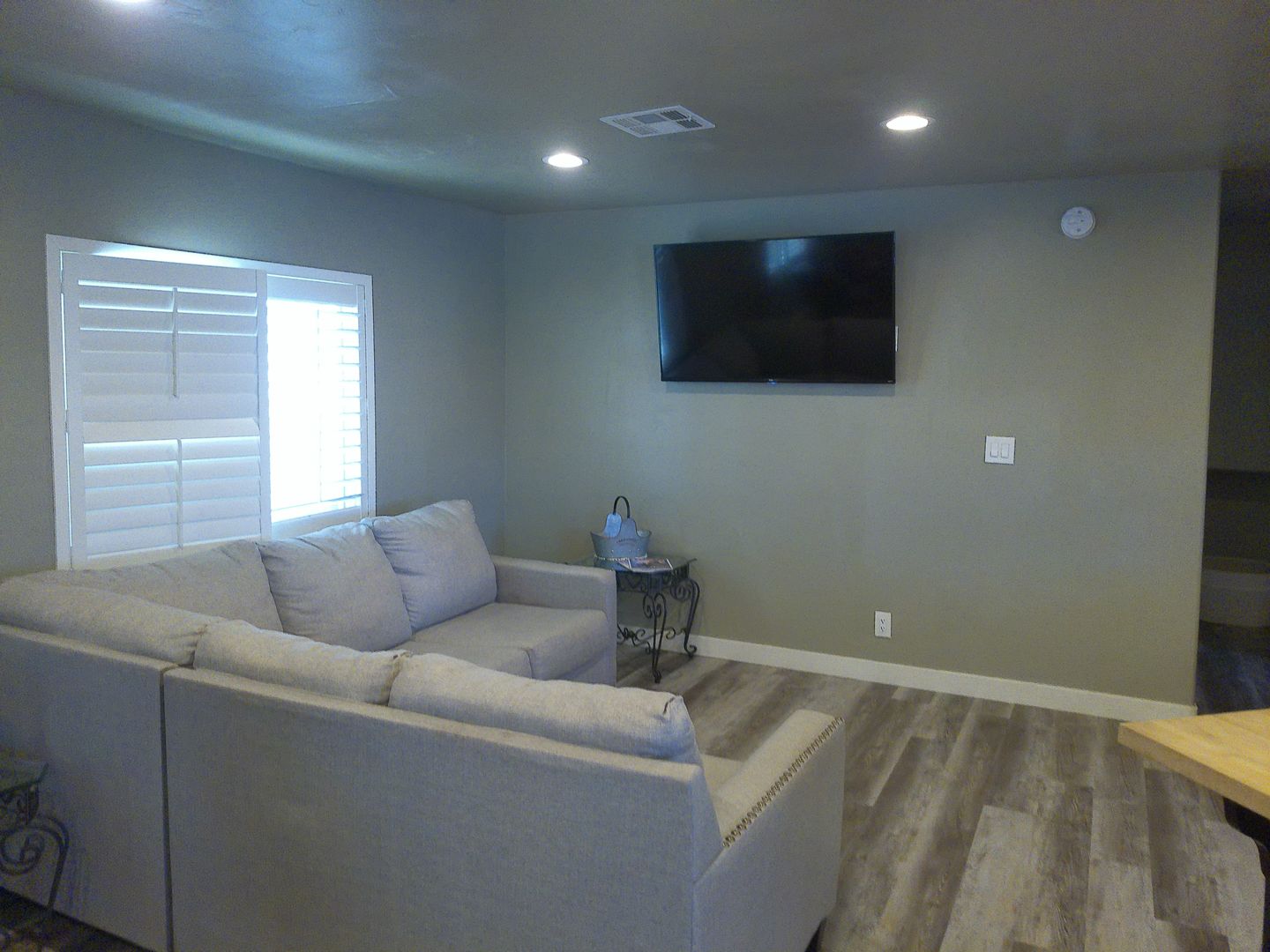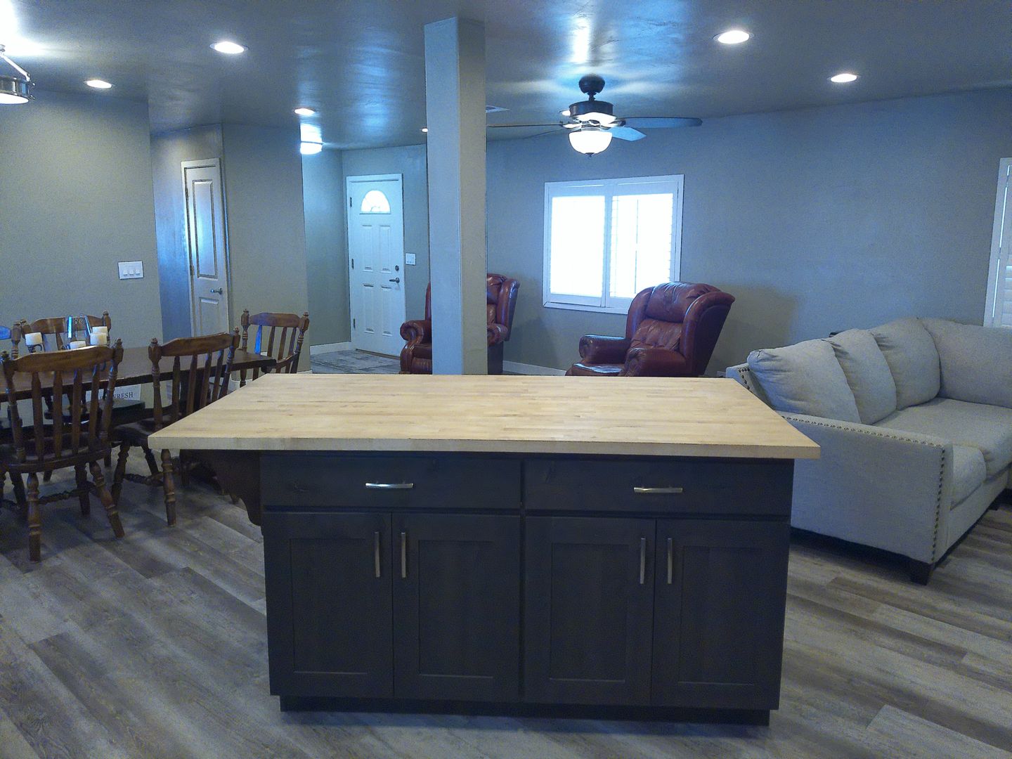 Welcome to this beautifully maintained double wide home featuring a spacious open floor plan perfect for comfortable living and entertaining. The living area includes a large sectional sofa, two wingback chairs, and a flat-panel TV, all flowing seamlessly into a generous dining space and an open kitchen.