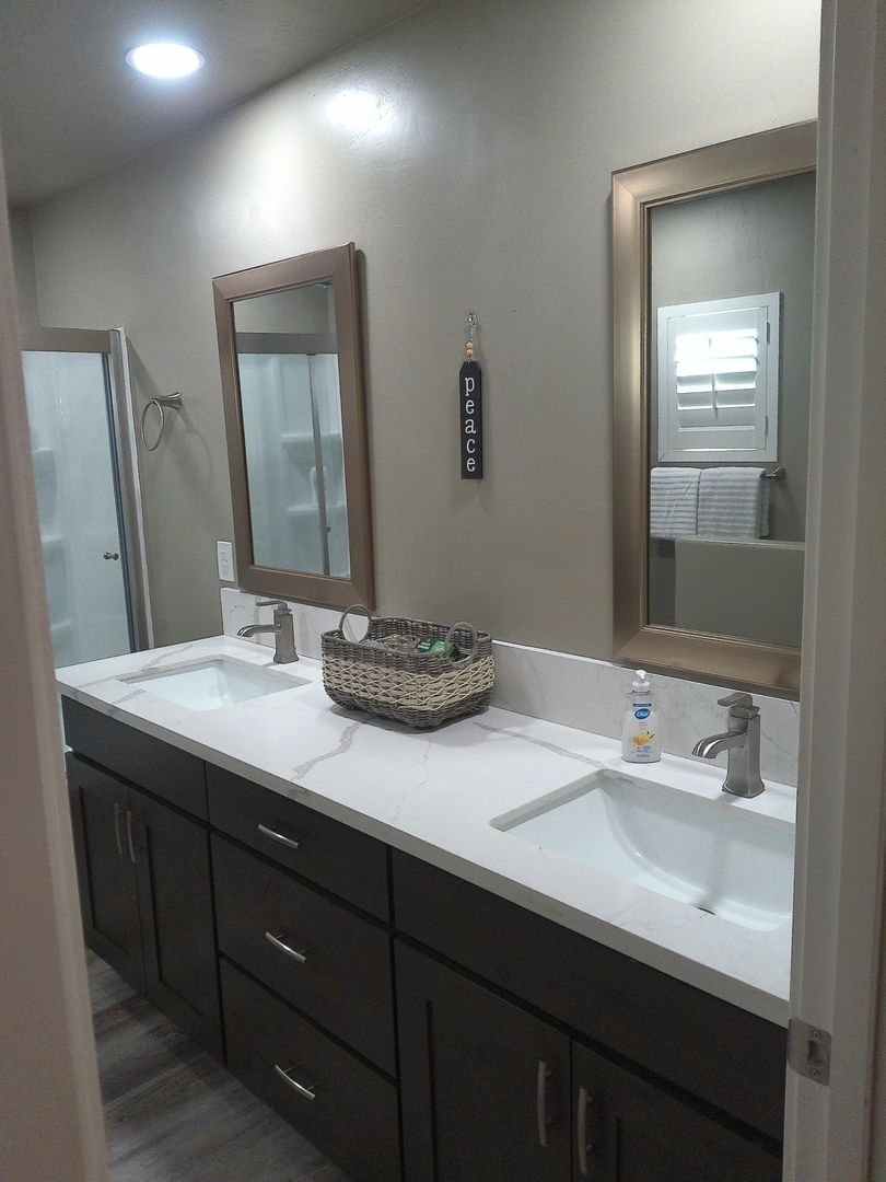 The primary bedroom offers a queen-size bed, two nightstands, and a tall dresser. The en-suite bathroom includes double vanity sinks and a tub/shower combo.