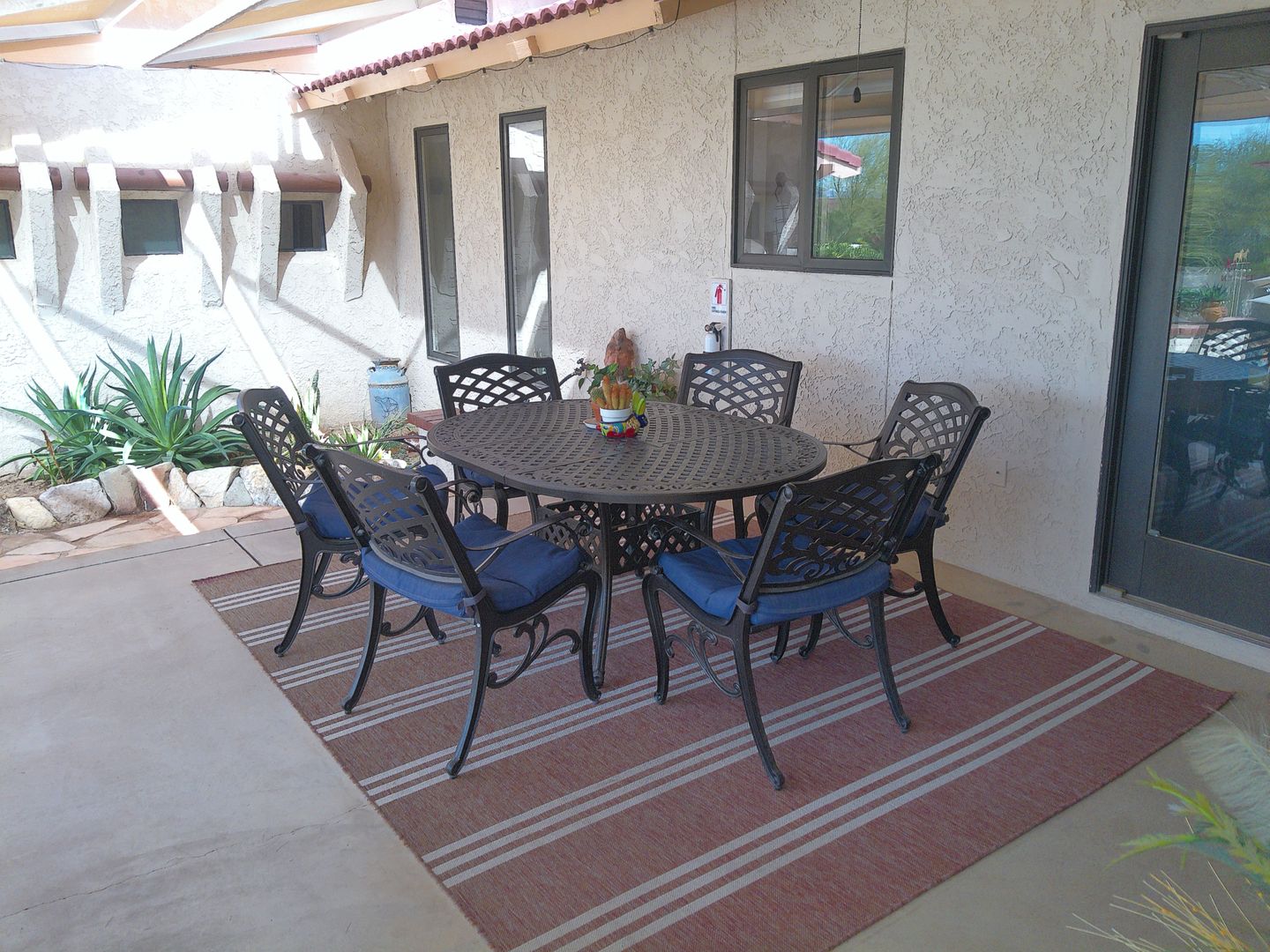 Backyard features a Table for 6, BBQ side seating overlooking the pool. Down by the pool, there is additional patio furniture & a diving board.