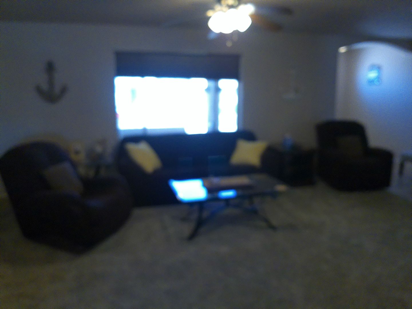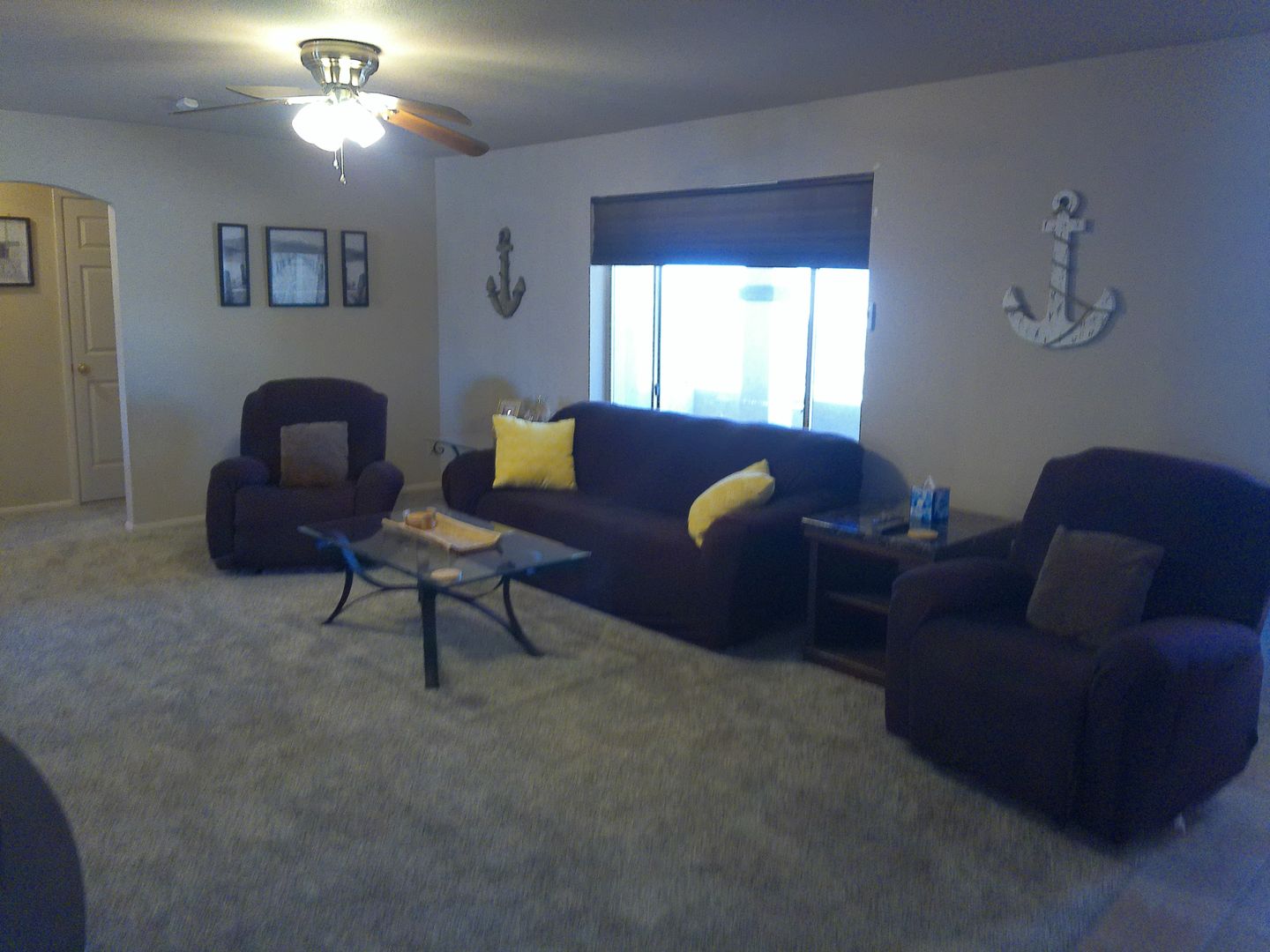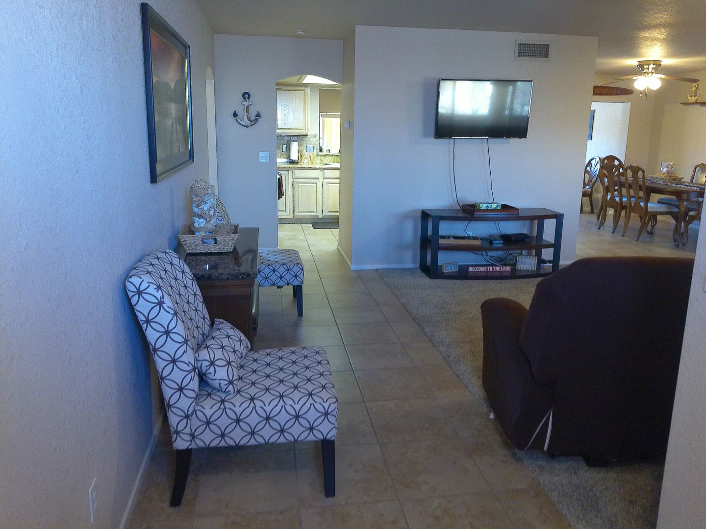 The living room is perfect for relaxing or entertaining, complete with a sofa, recliner, chair, coffee table, and a flat-panel TV.