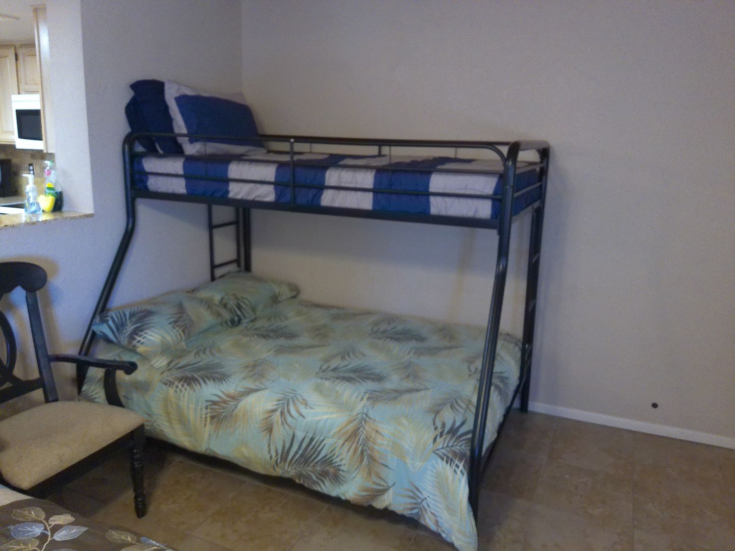 A spacious bonus room provides additional sleeping arrangements, including a queen bed, a daybed with trundle, and a bunk bed (full-size on bottom, twin-size on top)—ideal for larger families or groups.